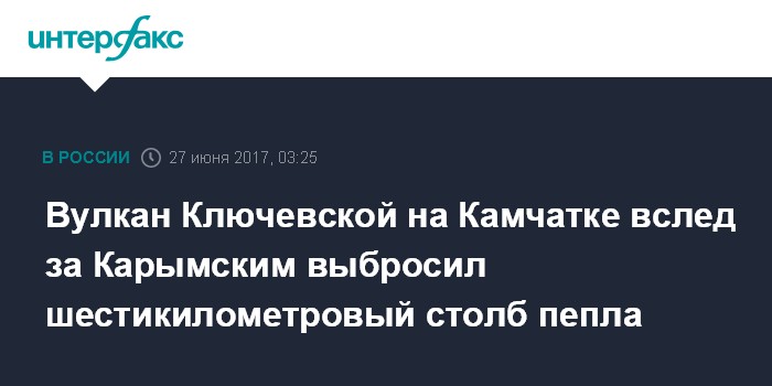 Москва. 27 июня. INTERFAX.RU - Столб пепла высотой шесть километров над уровнем моря выбросил Ключевской вулкан, извергающийся на Камчатке, сообщает Камчатская группа реагирования на вулканические извержения (KVERT) Института вулканологии и сейсмологии Дальневосточного отделения Российской академии наук (РАН).