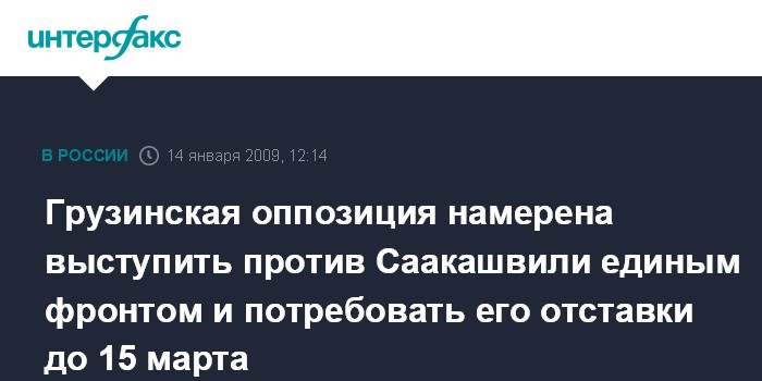 Как стало известно "Интерфаксу" от источника в Объединенной оппозиции, в настоящее время проходят консультации между всеми грузинскими оппозиционными силами по выработке совместного меморандума, в котором будет выдвинуто требование к президенту Михаилу Саакашвили до 15 марта подать в отставку с должности. В случае невыполнения этого требования, грузинская оппозиция намерена начать широкомасштабные антиправительственные акции по всей Грузии.