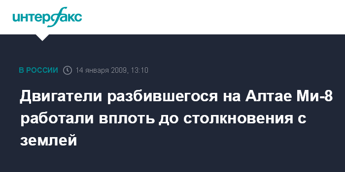 Москва. 14 января. INTERFAX.RU - Двигатели разбившегося в Республике Алтай вертолета Ми-171 были работоспособны вплоть до столкновения с землей, говорится в сообщении Межгосударственного авиационного комитета (МАК).