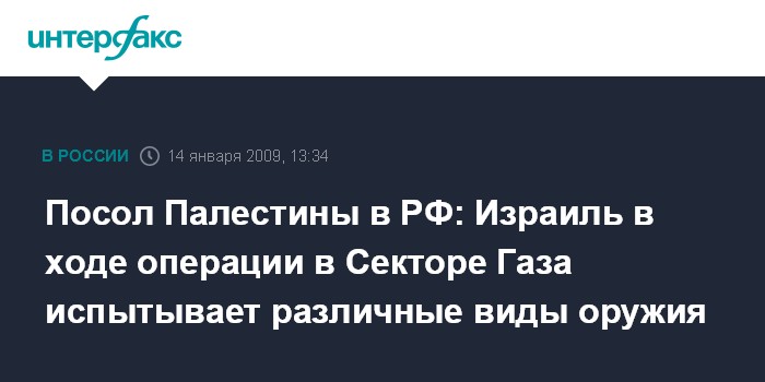 Москва. 14 января. INTERFAX.RU - Израиль рассматривает Сектор Газа в качестве "лаборатории" для испытания различных видов оружия, заявил посол Палестины в России Афиф Сафия.