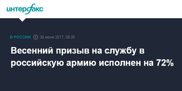 Москва. 30 июня. INTERFAX.RU - Более 102 тысяч человек отправлены в войска в рамках весеннего призыва в России, это составляет 72% от установленной нормы, сообщил начальник Главного организационно-мобилизационного управления Генштаба ВС РФ Василий Тонкошкуров.