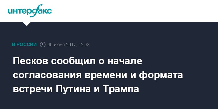 Москва. 30 июня. INTERFAX.RU - Пресс-секретарь президента РФ Дмитрий Песков сообщил, что в четверг, 29 июня, было принято решение согласовать время и формат встречи российского лидера Владимира Путина и его американского коллеги Дональда Трампа на саммите "большой двадцатки" в Гамбурге, который состоится 7-8 июля.