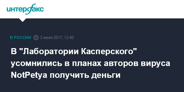 Москва. 2 июля. INTERFAX.RU - Кибератака на ряд крупных компаний и организаций по всему миру с использованием вируса-вымогателя NotPetya была проведена не с целью личного обогащения, сообщили "Интерфаксу" в воскресенье в пресс-службе "Лаборатории Касперского".