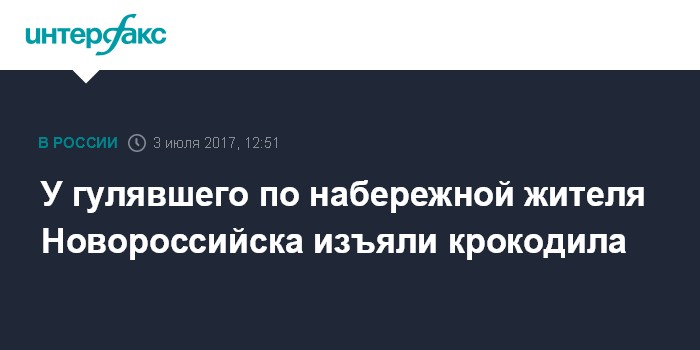 Москва. 3 июля. INTERFAX.RU - Сотрудники природоохранной прокуратуры изъяли крокодила у жителя Новороссийска, когда он выгуливал хищника на поводке по городской набережной.