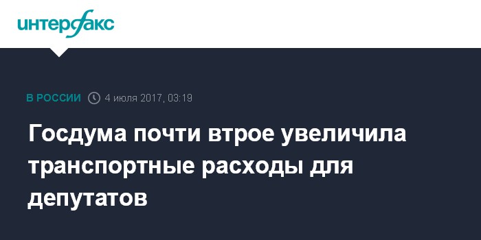 Москва. 4 июля. INTERFAX.RU - Госдума почти втрое увеличила транспортные расходы депутатов - с 296,8 тыс. до 830 тыс. рублей на одного парламентария в год, в дальнейшем сумма может быть еще пересмотрена в сторону увеличения, сообщает во вторник газета "Известия" со ссылкой на источники в Госдуме.