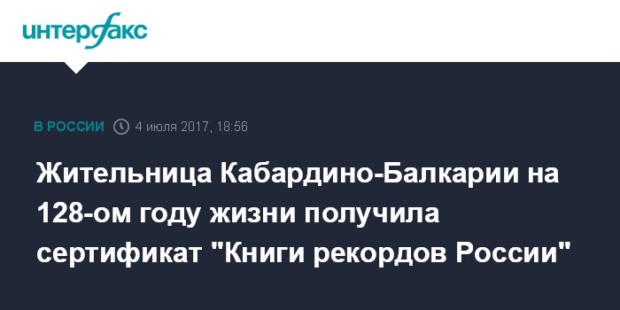 Москва. 4 июля. INTERFAX.RU - Жительница Баксанского района Кабардино-Балкарии признана самым пожилым человеком в России, сообщает пресс-служба главы и правительства республики во вторник.