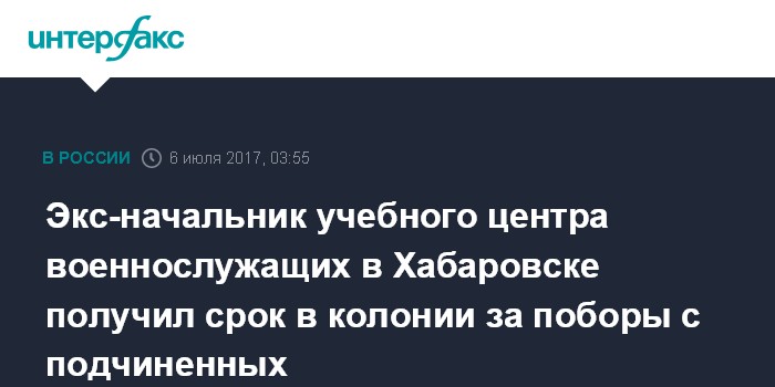 Москва. 6 июля. INTERFAX.RU - Суд в Хабаровске вынес приговор по делу экс-начальника учебного центра подготовки младших специалистов мотострелковых войск 392-го окружного учебного центра Восточного военного округа (ВВО), который обирал подчиненных, сообщило управление ФСБ России по ВВО.