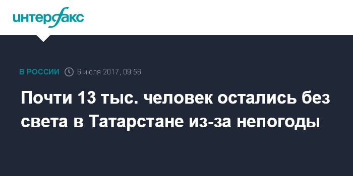 Москва. 6 июля. INTERFAX.RU - Ливни, грозы и сильный ветер привели к энергоавариям в Татарстане, энергоснабжение прервано в 103 населенных пунктах 10 районов республики, сообщается на сайте ГУ МЧС по Татарстану в четверг.