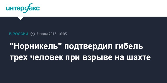 Москва. 7 июля. INTERFAX.RU - Три человека погибли при взрыве, предположительно, паров метана в шахте рудника "Заполярная" (Норильск, Красноярский край), сообщила пресс-служба ГМК "Норникель".