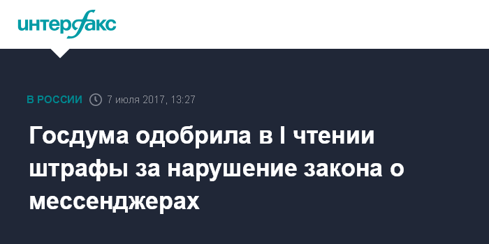 Москва. 7 июля. INTERFAX.RU - Госдума в пятницу приняла в первом чтении законопроект об административных штрафах за несоблюдение обязанностей, прописанных в законопроекте о мессенджерах.