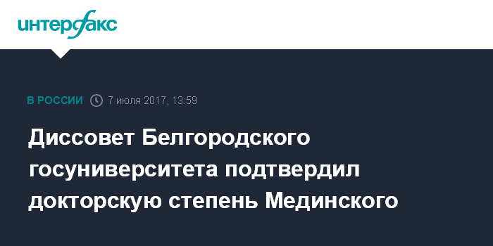 Диссовет Белгородского госуниверситета подтвердил докторскую степень Мединского