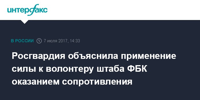 Москва. 7 июля. INTERFAX.RU - В Росгвардии разъяснили, что применили физическую силу к волонтеру Фонда борьбы с коррупцией, где накануне прошли обыски, после того, как он не выполнил законные требования сотрудников правоохранительных органов и оказал сопротивление.