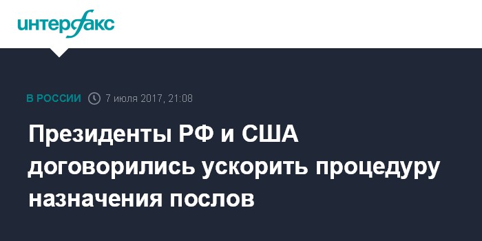 Москва. 7 июля. INTERFAX.RU - Президенты РФ и США Владимир Путин и Дональд Трамп на встрече в Гамбурге условились ускорить процедуру назначения послов РФ в Вашингтоне и США в Москве, заявил в пятницу глава МИД России Сергей Лавров.