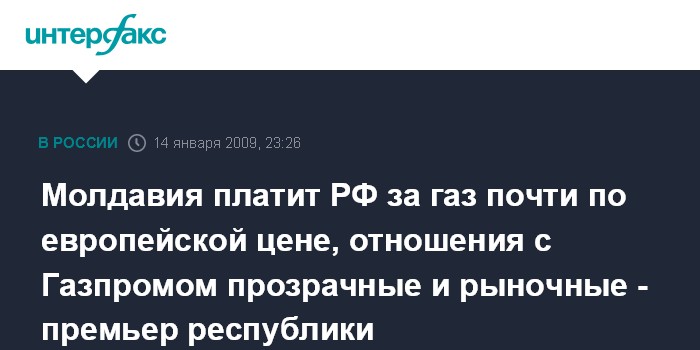 Москва. 14 января. ИНТЕРФАКС-АГИ - Потребители Молдавии рассчитываются за российский газ практически по среднеевропейской цене, заявила премьер-министр республики Зинаида Гречаная в среду в Москве на встрече с руководством "Газпрома".