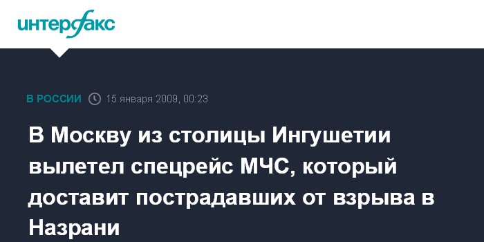 Москва. 15 января. ИНТЕРФАКС - Самолет МЧС России Ил-76, с ранеными на борту, вылетел из столицы Ингушетии в Москву.