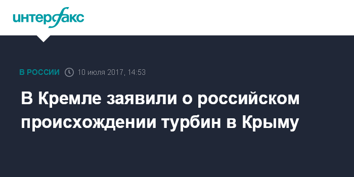 Москва. 10 июля. INTERFAX.RU - Пресс-секретарь президента РФ Дмитрий Песков заявил, что турбины, которые устанавливают для теплоэлектростанций на территории Крыма, произведены в России.