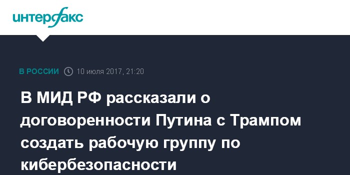 Ранее, по итогам встречи президентов РФ и США на "полях" саммита G20 в Гамбурге была достигнута договорённость о создании совместной рабочей группы по кибербезопасности. Трамп впоследствии прокомментировал данный проект у себя в твиттере, выразив сомнение в том, что он сможет быть осуществлен.