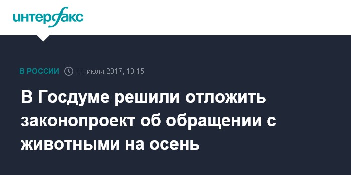 Москва. 11 июля. INTERFAX.RU - Совет Государственной Думы на заседании во вторник принял решение перенести второе чтение законопроекта "Об ответственном обращении с животными" на осеннюю сессию, сообщил "Интерфаксу" один из членов совета Думы. "Законопроект очень сложный и пока по нему нет единства даже в среде зоозащитников", - сказал собеседник агентства.