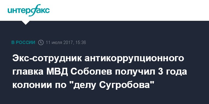 Москва. 11 июля. INTERFAX.RU - Мосгорсуд приговорил к трем годам колонии общего режима фигуранта "дела Сугробова", бывшего сотрудника антикоррупционного главка МВД (ГУЭБиПК) Геннадия Соболева, признанного виновным в превышении полномочий, сообщили в понедельник "Интерфаксу" в пресс-службе суда.