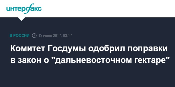Москва. 12 июля. INTERFAX.RU - Комитет Государственной Думы по природным ресурсам, собственности и земельным отношениям одобрил поправки в закон о "дальневосточном гектаре", предложенные министерством РФ по развитию Дальнего Востока.