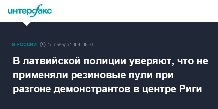 Москва. 15 января. INTERFAX.RU - Госполиция Латвии отрицает факт использования резиновых пуль для усмирения агрессивно настроенных демонстрантов в Старой Риге, подтверждая при этом использование таких спецсредств как дубинки и баллончики со слезоточивым газом.