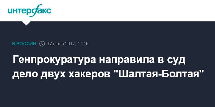 Москва. 12 июля. INTERFAX.RU - Генпрокуратура направила в суд уголовное дело двух обвиняемых в причастности к хакерской группе "Шалтай-Болтай", сообщили в пресс-службе надзорного ведомства.