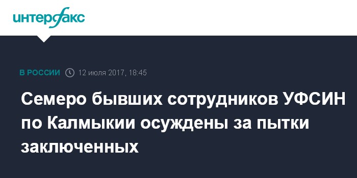 Москва. 12 июля. INTERFAX.RU - Элистинский городской суд в среду вынес обвинительный приговор семерым бывшим сотрудникам Управления ФСИН по Калмыкии, признав их виновными в пытках заключенных, сообщает пресс-служба следственного управления СКР по региону.