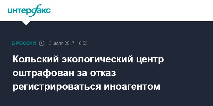Москва. 13 июля. INTERFAX.RU - Апатитский городской суд оштрафовал мурманскую областную общественную организацию "Кольский экологический центр" (КЭЦ) за отказ добровольно регистрироваться в качестве некоммерческой организации (НКО), выполняющей функции иноагента.