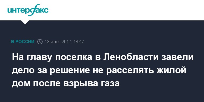 Москва. 13 июля. INTERFAX.RU - На главу администрации поселка Лаголово завели уголовное дело о халатности после того, как он не расселил двухэтажный дом с тремя десятками жильцов, после взрыва газа.