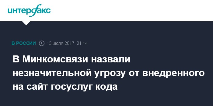 Москва. 13 июля. INTERFAX.RU - Минкомсвязь не ожидает отрицательных последствий для пользователей портала госуслуг от присутствия на ресурсе внедренного потенциально вредоносного кода, говорится в сообщении Минкомсвязи.