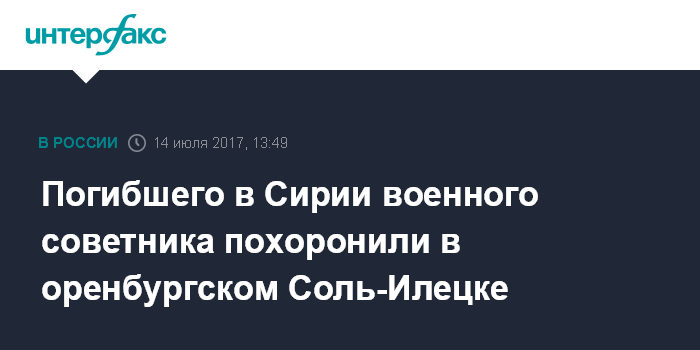 Москва. 14 июля. INTERFAX.RU - Церемония прощания с погибшим в Сирии военным советником, капитаном Николаем Афанасовым прошла в пятницу в Оренбургской области.