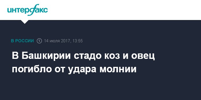 Москва. 14 июля. INTERFAX.RU -В Зианчуринском районе Башкирии от удара молнии погибла большая часть стада мелкого рогатого скота, находившегося на выпасе в поле, сообщили агентству "Интерфакс" в районной администрации в пятницу.