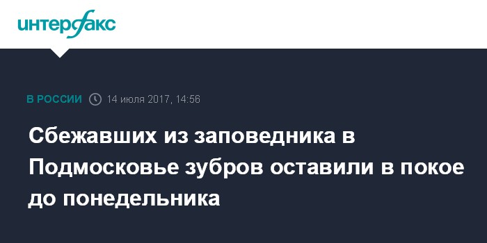 Москва. 14 июля. INTERFAX.RU - Облавы на зубров, сбежавших из Приокско-Террасного заповедника в Подмосковье, временно прекращены. Об этом сообщил "Интерфаксу" специалист отдела экологического просвещения и познавательного туризма Сергей Маслов.