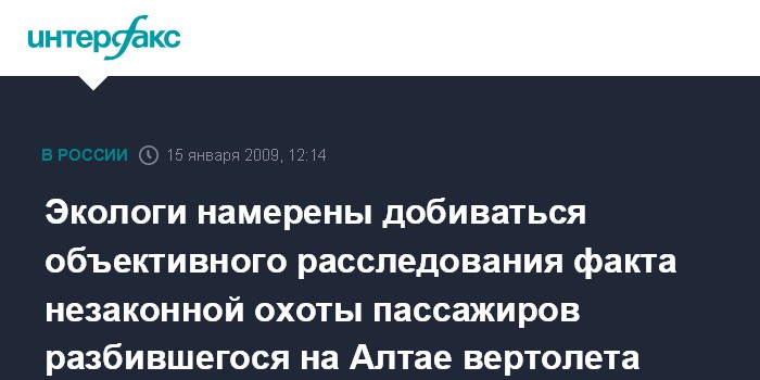 Москва. 15 января. INTERFAX.RU - Экологи обещают держать на контроле расследование катастрофы в Горном Алтае вертолета Ми-171, пассажиры которого, по предварительным данным, незаконно охотились на горных баранов аргали.