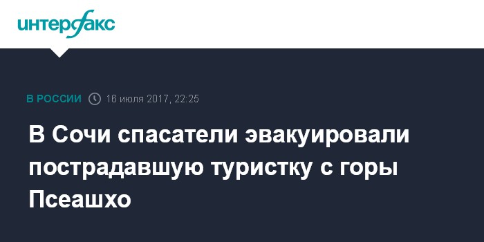 Москва. 16 июля. INTERFAX.RU - Спасатели Краснополянского отряда "Кубань-Спас" и Южного регионального поисково-спасательного отряда МЧС России эвакуировали туристку, сломавшую ногу во время похода в урочище Медвежьи ворота горы Псеашхо, сообщил агентству "Интерфакс" начальник отряда Михаил Марвани в воскресенье.