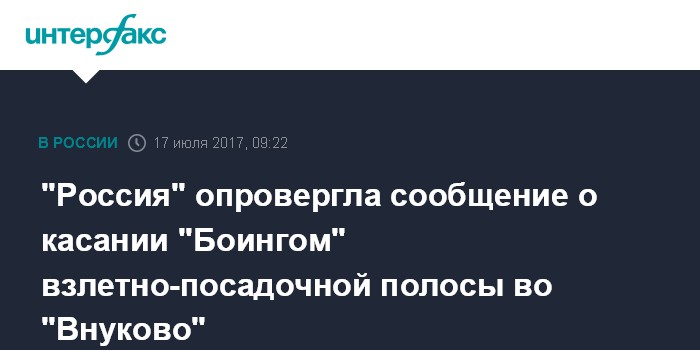 Москва. 17 июля. INTERFAX.RU - Официальный представитель авиакомпании "Россия" опроверг сообщение о том, что ее самолет задел хвостом взлетно-посадочную полосу аэропорта "Внуково".