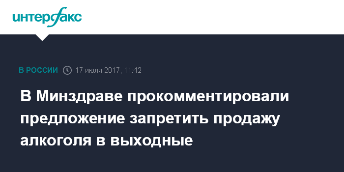 Москва. 17 июля. INTERFAX.RU - Никаких решений по запрету продажи алкоголя в России в выходные дни не принималось, вместе с тем эксперты обсуждают ряд мер по борьбе с пьянством, сообщают в Минздраве.