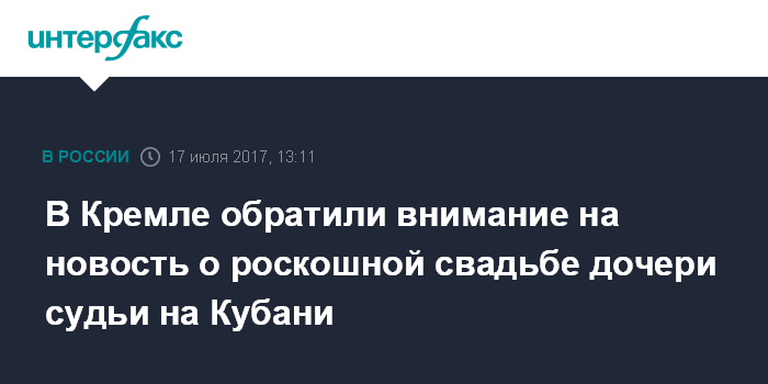 Москва. 17 июля. INTERFAX.RU - Пресс-секретарь президента РФ Дмитрий Песков сообщил, что в Кремле обратили внимание на новость о свадьбе дочери судьи в Краснодарском крае, однако считают, что реагировать на подобные проявления является не их прерогативой, а других ведомств.