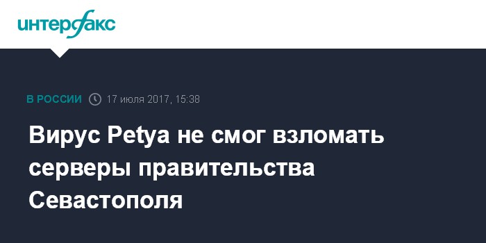 Москва. 17 июля. INTERFAX.RU - Сетевой вирус-шифровальщик Petya атаковал серверы правительства Севастополя, однако данные, хранящиеся на компьютерах в государственных учреждениях региона, не пострадали, сообщило главное управление информатизации и связи исполнительного органа власти города.