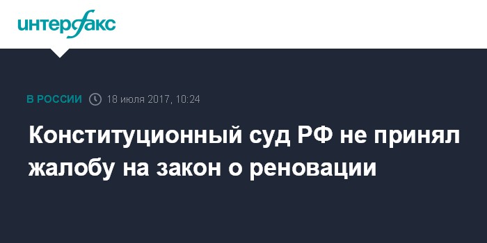 Москва. 18 июля. INTERFAX.RU - Жалоба жительницы Москвы Оксаны Юнановой и ее представителей на закон о реновации не принята Конституционным судом РФ.