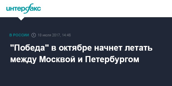 Москва. 18 июля. INTERFAX.RU - Низкобюджетная авиакомпания "Победа" (входит в группу "Аэрофлот") открыла продажу билетов на регулярный рейс Москва - Санкт-Петербург, сообщает пресс-служба авиакомпании.