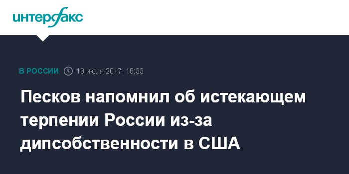 Москва. 18 июля. INTERFAX.RU - Россия рассчитывает на решение вопроса с арестованной дипсобственностью в США, терпение Москвы "по-прежнему истекает", заявил пресс-секретарь президента РФ Дмитрий Песков.