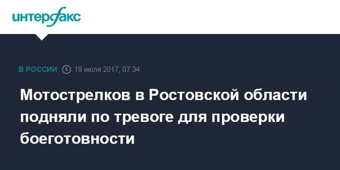 Москва. 19 июля. INTERFAX.RU - Мотострелковая часть общевойсковой армии, дислоцированной в Ростовской области, по приказу командующего войсками Южного военного округа (ЮВО) генерал-полковника Александра Дворникова поднята по тревоге с целью проверки боевой готовности, сообщил начальник пресс-службы ЮВО полковник Вадим Астафьев.