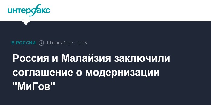 В среду в рамках авиасалона "МАКС-2017" между Россией и Малайзией подписан меморандум о модернизации самолетов МиГ-29Н и МиГ-29К/КУБ для малазийских ВВС. С российской стороны соглашение заключил глава "Рособоронэкспорта" Александр Михеев.