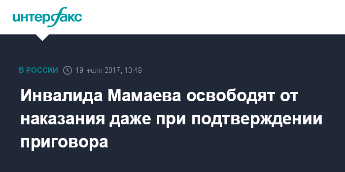 Москва. 19 июля. INTERFAX.RU - Инвалид I группы Антон Мамаев, осуждённый за разбой на 4,5 года колонии и освобождённый в среду из-под стражи, не будет отбывать наказание, даже если апелляция подтвердит приговор.