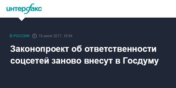 Москва. 19 июля. INTERFAX.RU - Авторы законопроекта об ответственности соцсетей за отказ удалить противоправный контент решили снова внести его в Госдуму после корректировки, сообщил председатель комитета Государственной Думы по информационной политике, информационным технологиям и связи Леонид Левин.