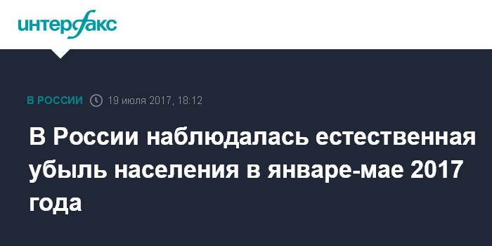 Число родившихся в РФ в январе-мае 2017 года снизилось до 679,2 тыс. человек с 762,5 тыс. человек за аналогичный период 2016 года. Число умерших в январе-мае 2017 года сократилось до 791 тыс. человек с 804,1 тыс. человек (в январе-мае 2016 года).