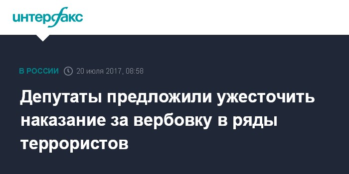 Москва. 20 июля. INTERFAX.RU - Первый заместитель руководителя фракции "Единая Россия" Адальби Шхагошев внес на рассмотрение Госдумы законопроект об увеличении в два раза уголовного наказания за вербовку в террористические организации, сообщили "Интерфаксу" в аппарате палаты.