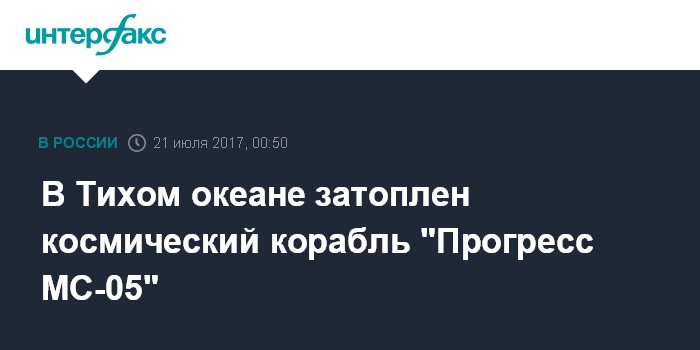 Москва. 21 июля. INTERFAX.RU - Космический "грузовик" "Прогресс МС-05", отстыкованный от Международной космической станции, затоплен в Тихом океане, сообщили "Интерфаксу" в Центре управления полетами.