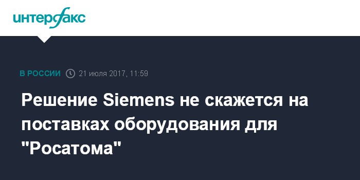 Москва. 21 июля. INTERFAX.RU - Ситуация с Siemens не скажется на поставках оборудования для ГК "Росатом", сообщили "Интерфаксу" в госкорпорации.